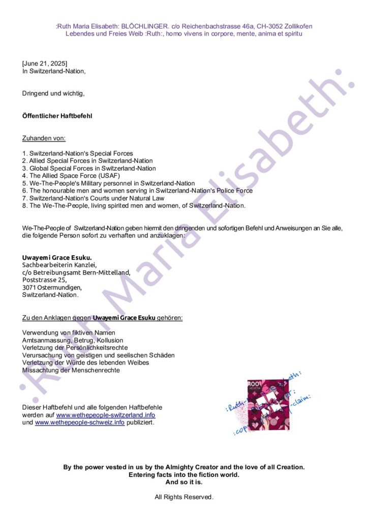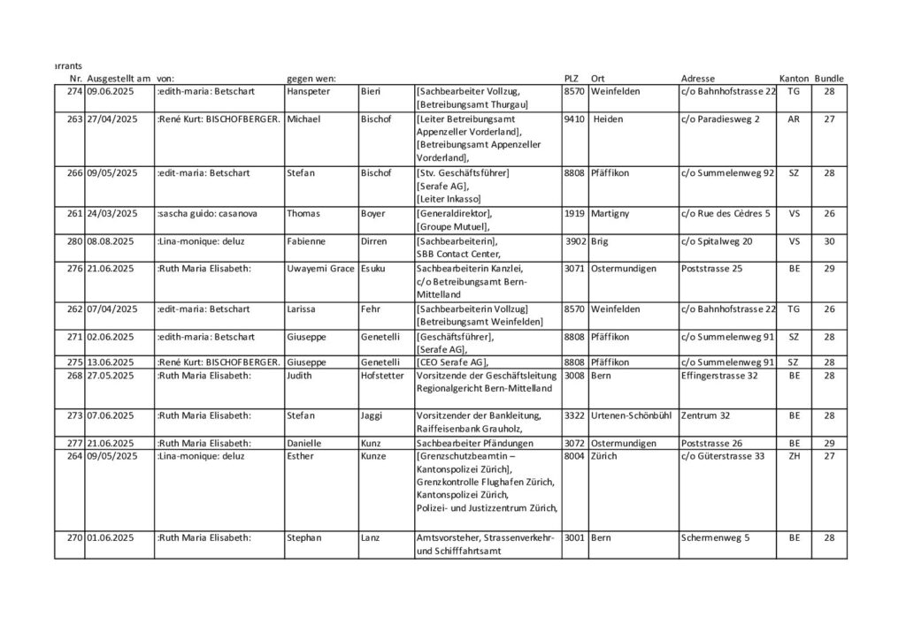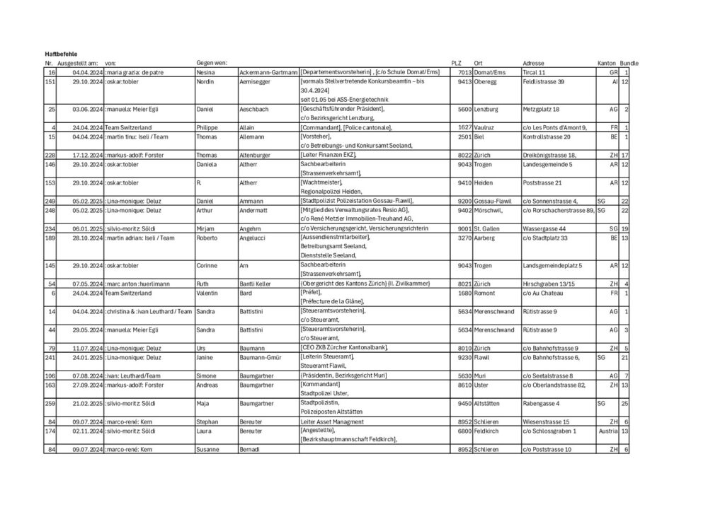 ARREST-WARRANTS : Step by step instructions, how to proceed These are only recommendations, the procedure is up to each sovereign individual. All Dokuments (https://wethepeople-switzerland.info/templates/): Example for all to send Attachment to Arrest Warrant